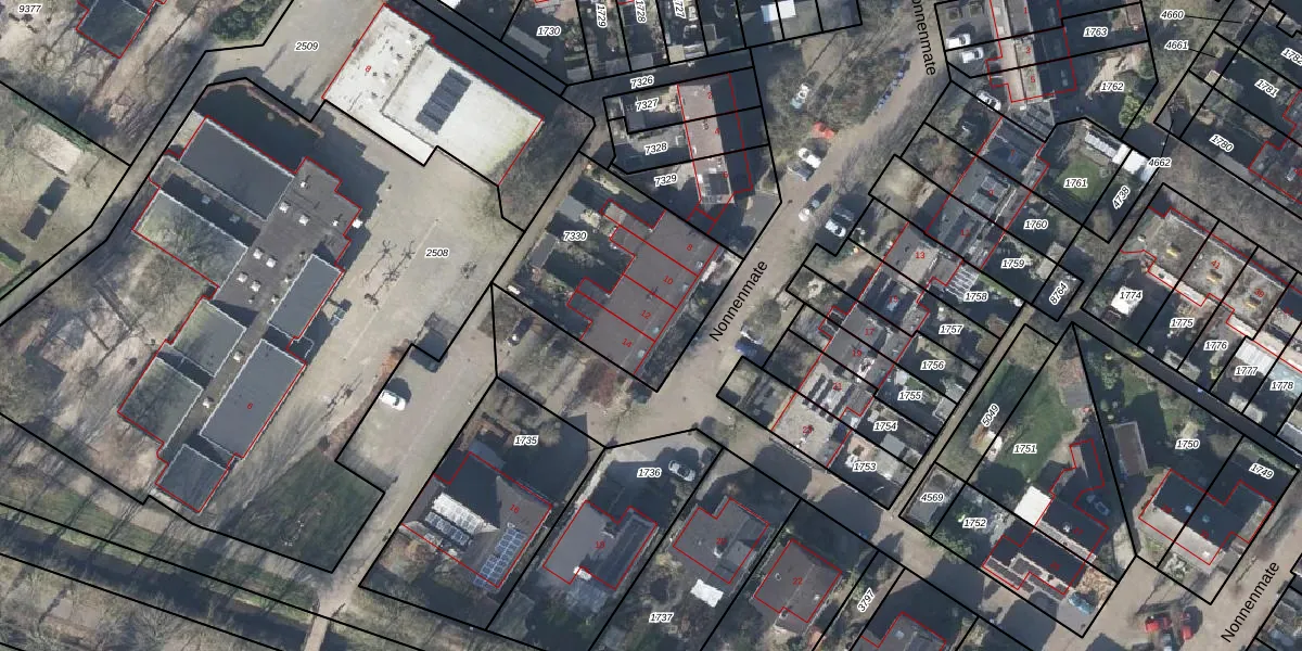 Het perceel waarop Nonnenmate 12 staat heeft een oppervlakte van 738 m². Dit is een groot perceel. De perceeloppervlakte wordt geregistreerd door het Kadaster. Gedetailleerde informatie over de maten van dit perceel kunt u vinden in het rapport Kadastrale kaart met maatvoering van Nonnenmate 12.