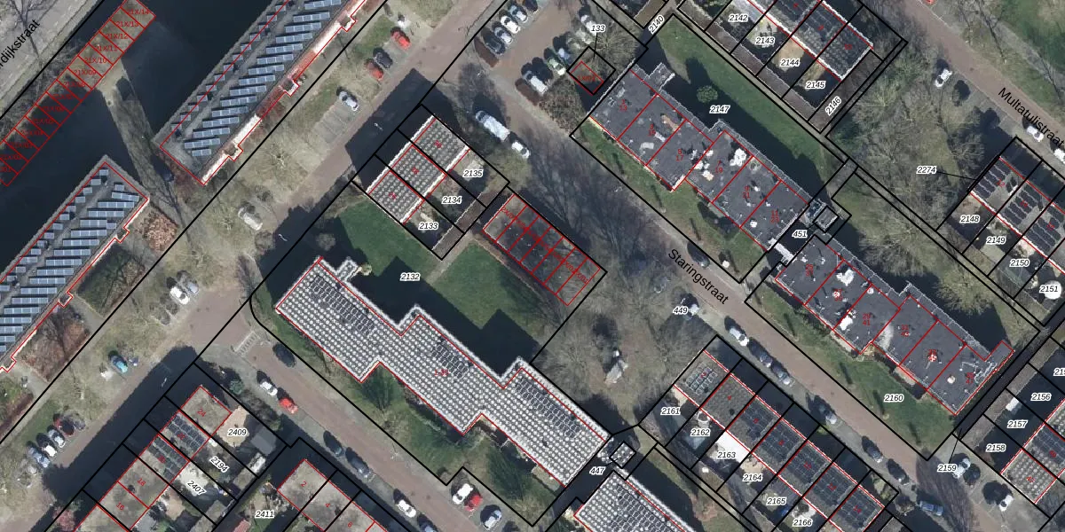 Het perceel waarop Staringstraat 2-X-04 staat heeft een oppervlakte van 2460 m². Dit is een zeer groot perceel. De perceeloppervlakte wordt geregistreerd door het Kadaster. Gedetailleerde informatie over de maten van dit perceel kunt u vinden in het rapport Kadastrale kaart met maatvoering van Staringstraat 2-X-04.