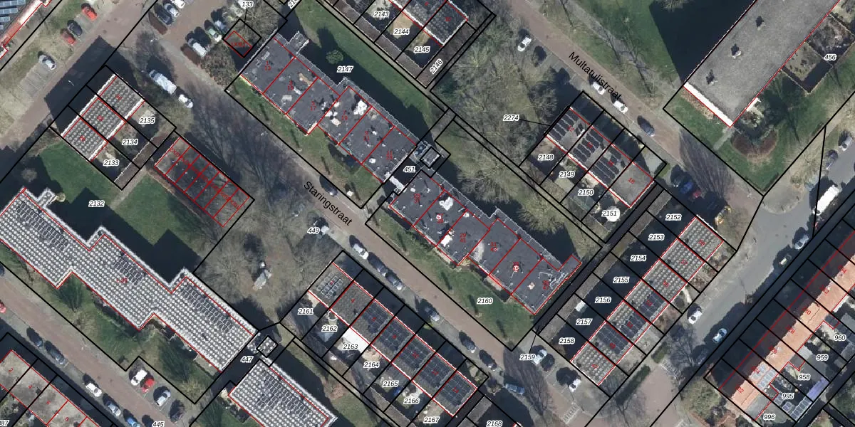 Het perceel waarop Staringstraat 39 staat heeft een oppervlakte van 1412 m². Dit is een zeer groot perceel. De perceeloppervlakte wordt geregistreerd door het Kadaster. Gedetailleerde informatie over de maten van dit perceel kunt u vinden in het rapport Kadastrale kaart met maatvoering van Staringstraat 39.