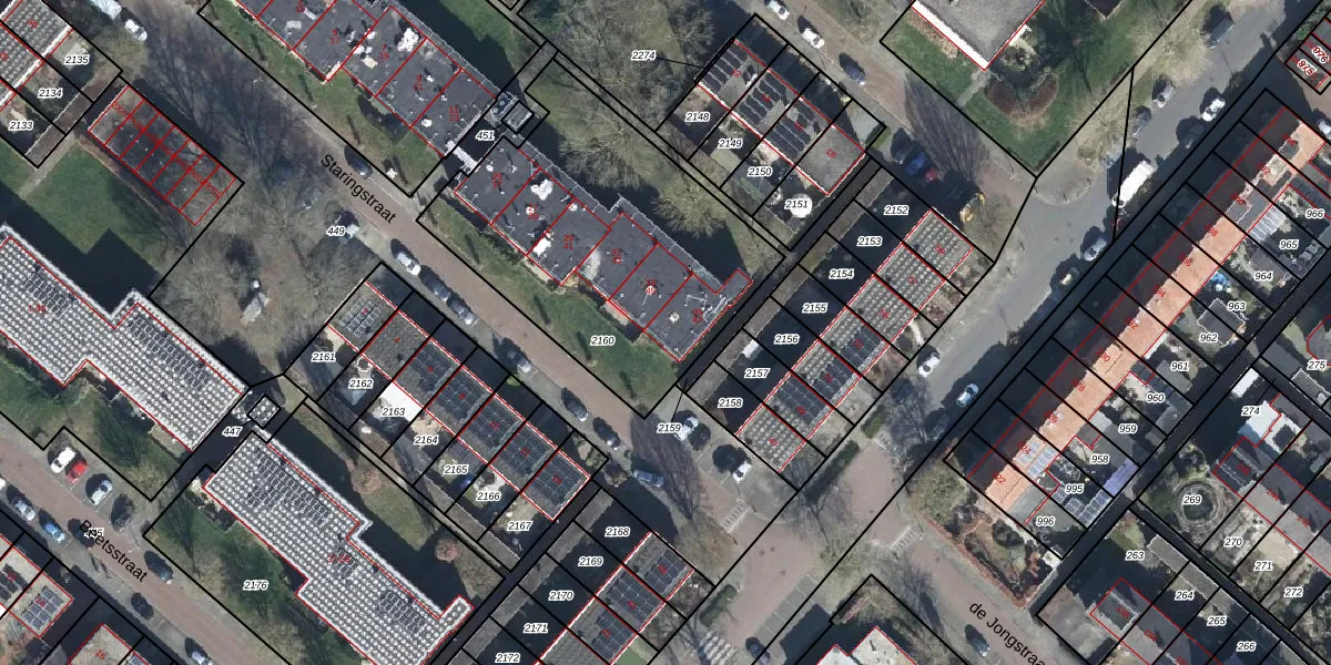 Het perceel waarop Staringstraat 47 staat heeft een oppervlakte van 1412 m². Dit is een zeer groot perceel. De perceeloppervlakte wordt geregistreerd door het Kadaster. Gedetailleerde informatie over de maten van dit perceel kunt u vinden in het rapport Kadastrale kaart met maatvoering van Staringstraat 47.