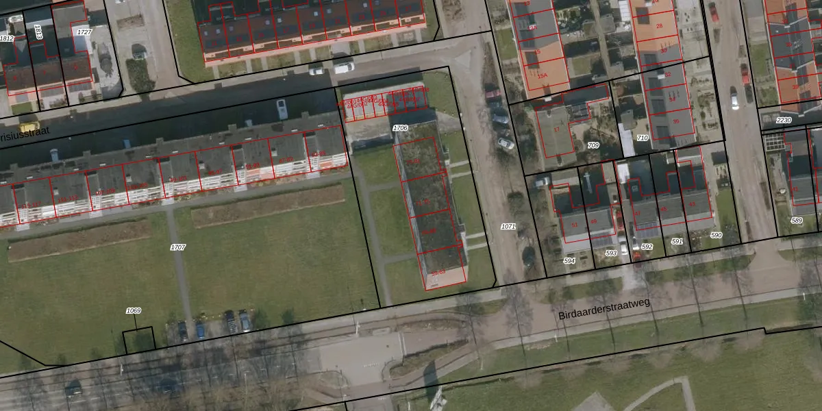 Het perceel waarop Birdaarderstraatweg 71 staat heeft een oppervlakte van 1580 m². Dit is een zeer groot perceel. De perceeloppervlakte wordt geregistreerd door het Kadaster. Gedetailleerde informatie over de maten van dit perceel kunt u vinden in het rapport Kadastrale kaart met maatvoering van Birdaarderstraatweg 71.
