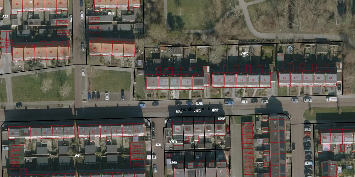 Het perceel waarop Bonifatiuspolder 9 staat heeft een oppervlakte van 3443 m². Dit is een zeer groot perceel. De perceeloppervlakte wordt geregistreerd door het Kadaster. Gedetailleerde informatie over de maten van dit perceel kunt u vinden in het rapport Kadastrale kaart met maatvoering van Bonifatiuspolder 9.