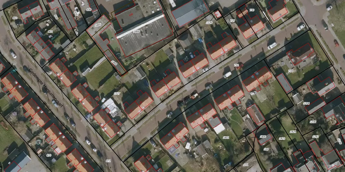 Het perceel waarop Buitentuin 16 staat heeft een oppervlakte van 3721 m². Dit is een zeer groot perceel. De perceeloppervlakte wordt geregistreerd door het Kadaster. Gedetailleerde informatie over de maten van dit perceel kunt u vinden in het rapport Kadastrale kaart met maatvoering van Buitentuin 16.