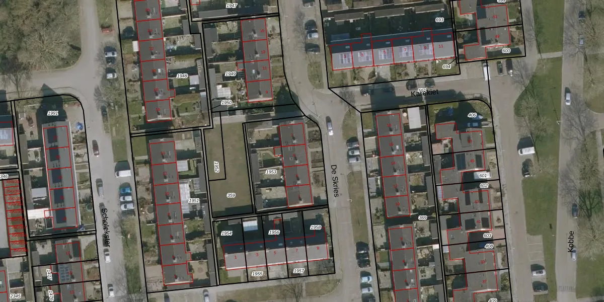 Het perceel waarop De Skries 5 staat heeft een oppervlakte van 732 m². Dit is een groot perceel. De perceeloppervlakte wordt geregistreerd door het Kadaster. Gedetailleerde informatie over de maten van dit perceel kunt u vinden in het rapport Kadastrale kaart met maatvoering van De Skries 5.