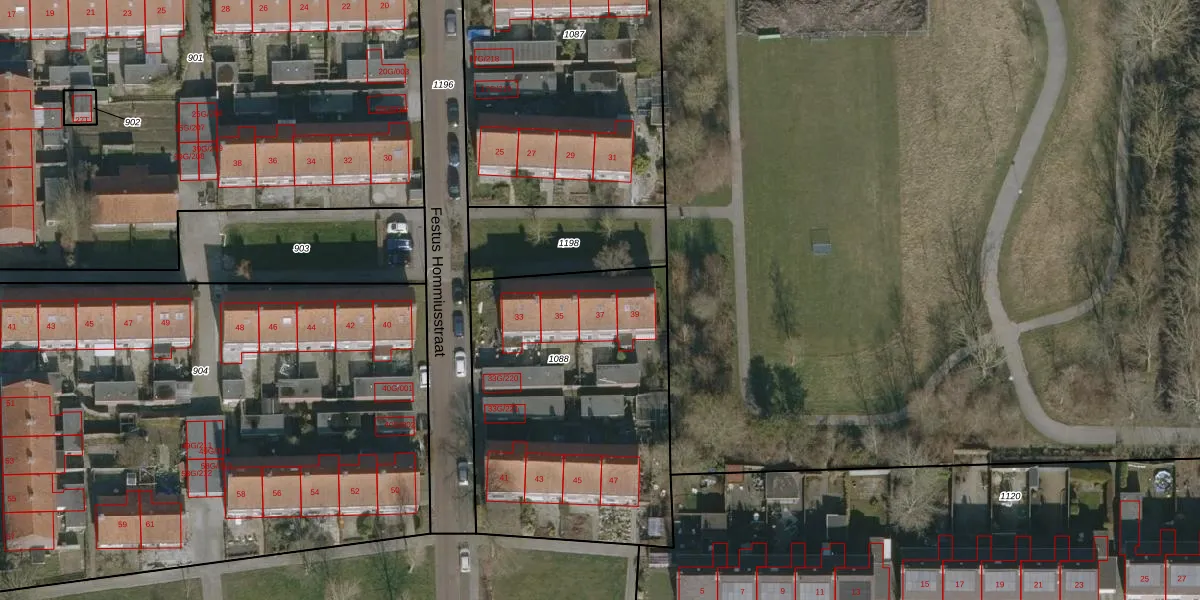 Het perceel waarop Festus Hommiusstraat 37 staat heeft een oppervlakte van 1455 m². Dit is een zeer groot perceel. De perceeloppervlakte wordt geregistreerd door het Kadaster. Gedetailleerde informatie over de maten van dit perceel kunt u vinden in het rapport Kadastrale kaart met maatvoering van Festus Hommiusstraat 37.