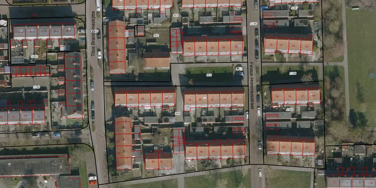 Het perceel waarop Festus Hommiusstraat 48 staat heeft een oppervlakte van 3557 m². Dit is een zeer groot perceel. De perceeloppervlakte wordt geregistreerd door het Kadaster. Gedetailleerde informatie over de maten van dit perceel kunt u vinden in het rapport Kadastrale kaart met maatvoering van Festus Hommiusstraat 48.