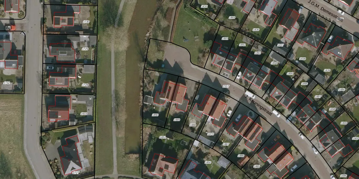 Het perceel waarop J. Keuningstraat 17 staat heeft een oppervlakte van 335 m². Dit is een groot perceel. De perceeloppervlakte wordt geregistreerd door het Kadaster. Gedetailleerde informatie over de maten van dit perceel kunt u vinden in het rapport Kadastrale kaart met maatvoering van J. Keuningstraat 17.