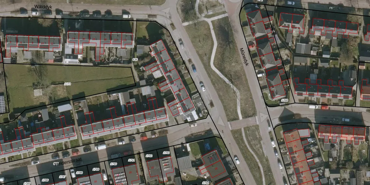 Het perceel waarop Mûnedyk 12 staat heeft een oppervlakte van 5635 m². Dit is een zeer groot perceel. De perceeloppervlakte wordt geregistreerd door het Kadaster. Gedetailleerde informatie over de maten van dit perceel kunt u vinden in het rapport Kadastrale kaart met maatvoering van Mûnedyk 12.