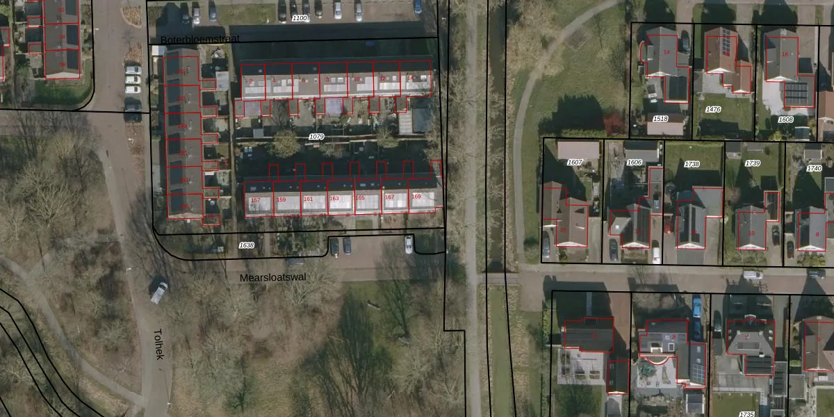 Het perceel waarop Mearsloatswal 169 staat heeft een oppervlakte van 3184 m². Dit is een zeer groot perceel. De perceeloppervlakte wordt geregistreerd door het Kadaster. Gedetailleerde informatie over de maten van dit perceel kunt u vinden in het rapport Kadastrale kaart met maatvoering van Mearsloatswal 169.
