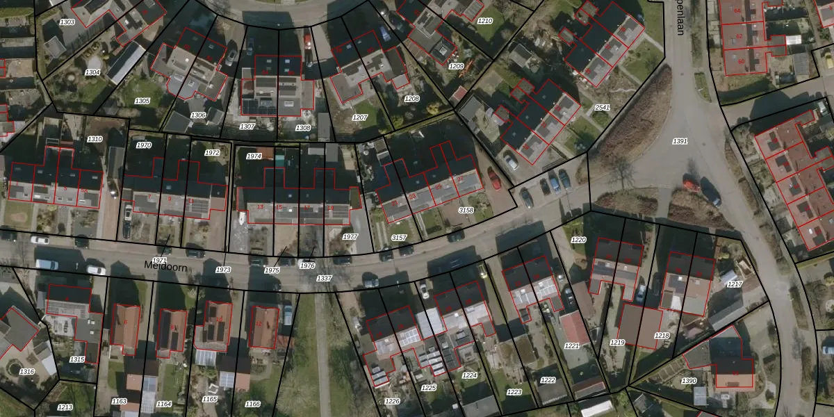 Het perceel waarop Meidoorn 23 staat heeft een oppervlakte van 607 m². Dit is een groot perceel. De perceeloppervlakte wordt geregistreerd door het Kadaster. Gedetailleerde informatie over de maten van dit perceel kunt u vinden in het rapport Kadastrale kaart met maatvoering van Meidoorn 23.