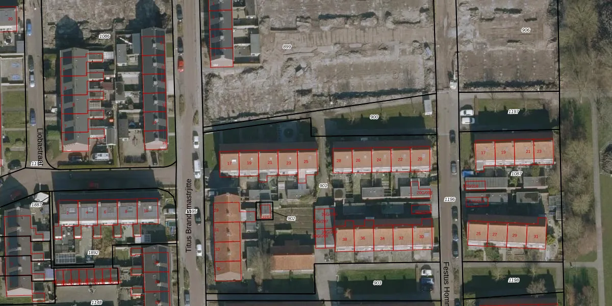Het perceel waarop Titus Brandsmastrjitte 25 staat heeft een oppervlakte van 3636 m². Dit is een zeer groot perceel. De perceeloppervlakte wordt geregistreerd door het Kadaster. Gedetailleerde informatie over de maten van dit perceel kunt u vinden in het rapport Kadastrale kaart met maatvoering van Titus Brandsmastrjitte 25.