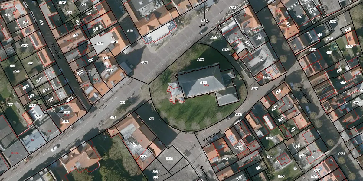 Het perceel waarop Markt 8 staat heeft een oppervlakte van 1315 m². Dit is een zeer groot perceel. De perceeloppervlakte wordt geregistreerd door het Kadaster. Gedetailleerde informatie over de maten van dit perceel kunt u vinden in het rapport Kadastrale kaart met maatvoering van Markt 8.