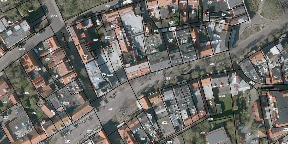 Ooststraat 3-A is gelegen op kadastraal perceel DBG03F718. Deze kadastrale aanduiding is uniek en wordt gebruikt door het Kadaster om eigendomsrechten en andere zakelijke rechten vast te leggen. Het perceel maakt onderdeel uit van de kadastrale gemeente Domburg.