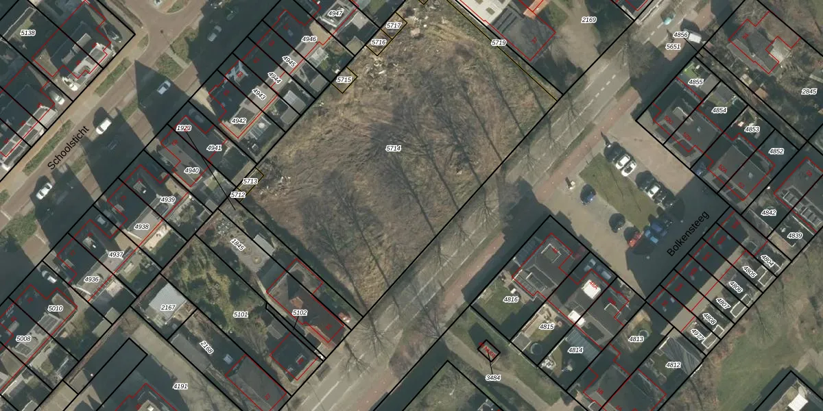 Het perceel waarop Bolkensteeg 33-E staat heeft een oppervlakte van 2975 m². Dit is een zeer groot perceel. De perceeloppervlakte wordt geregistreerd door het Kadaster. Gedetailleerde informatie over de maten van dit perceel kunt u vinden in het rapport Kadastrale kaart met maatvoering van Bolkensteeg 33-E.