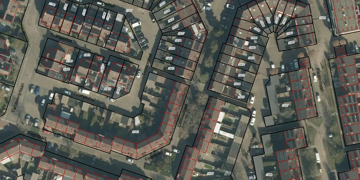 Het perceel waarop Cimbaalpad 20 staat heeft een oppervlakte van 2026 m². Dit is een zeer groot perceel. De perceeloppervlakte wordt geregistreerd door het Kadaster. Gedetailleerde informatie over de maten van dit perceel kunt u vinden in het rapport Kadastrale kaart met maatvoering van Cimbaalpad 20.
