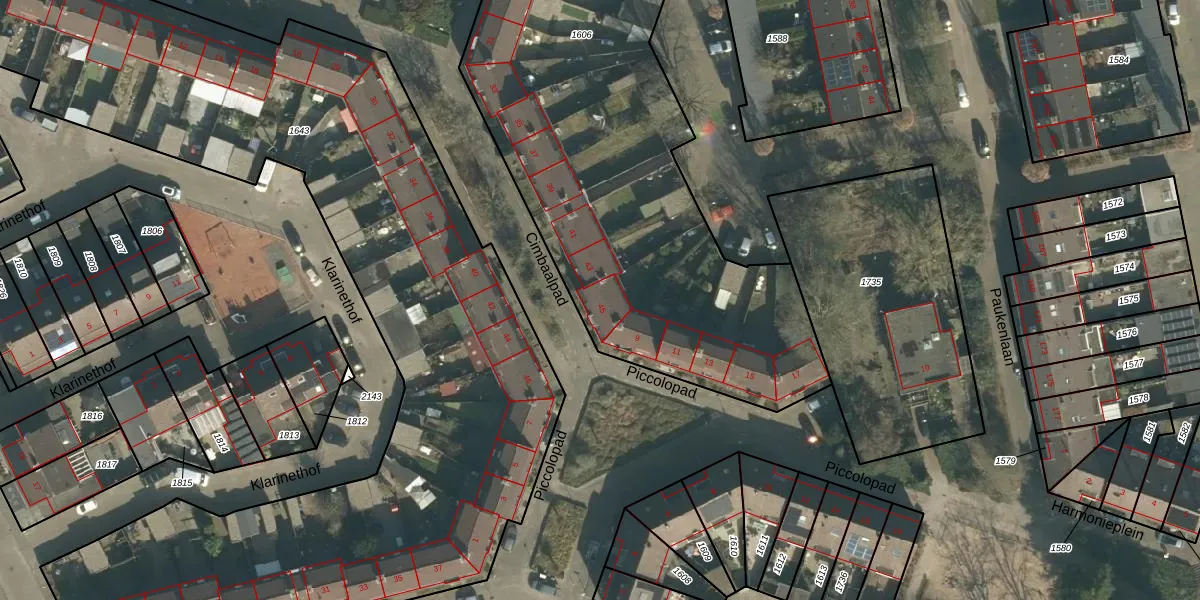Het perceel waarop Cimbaalpad 45 staat heeft een oppervlakte van 2950 m². Dit is een zeer groot perceel. De perceeloppervlakte wordt geregistreerd door het Kadaster. Gedetailleerde informatie over de maten van dit perceel kunt u vinden in het rapport Kadastrale kaart met maatvoering van Cimbaalpad 45.
