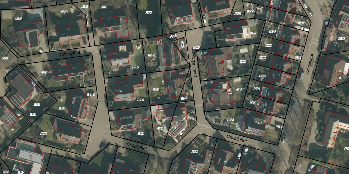 Het perceel waarop Crispijnhof 25 staat heeft een oppervlakte van 386 m². Dit is een groot perceel. De perceeloppervlakte wordt geregistreerd door het Kadaster. Gedetailleerde informatie over de maten van dit perceel kunt u vinden in het rapport Kadastrale kaart met maatvoering van Crispijnhof 25.