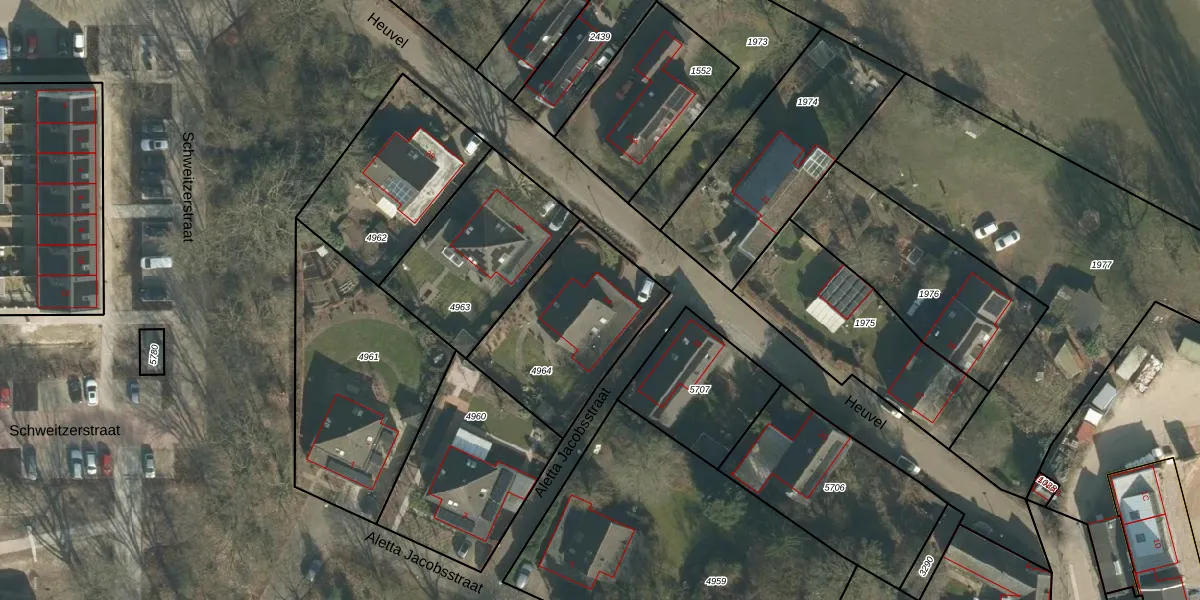Het perceel waarop Heuvel 24 staat heeft een oppervlakte van 595 m². Dit is een groot perceel. De perceeloppervlakte wordt geregistreerd door het Kadaster. Gedetailleerde informatie over de maten van dit perceel kunt u vinden in het rapport Kadastrale kaart met maatvoering van Heuvel 24.
