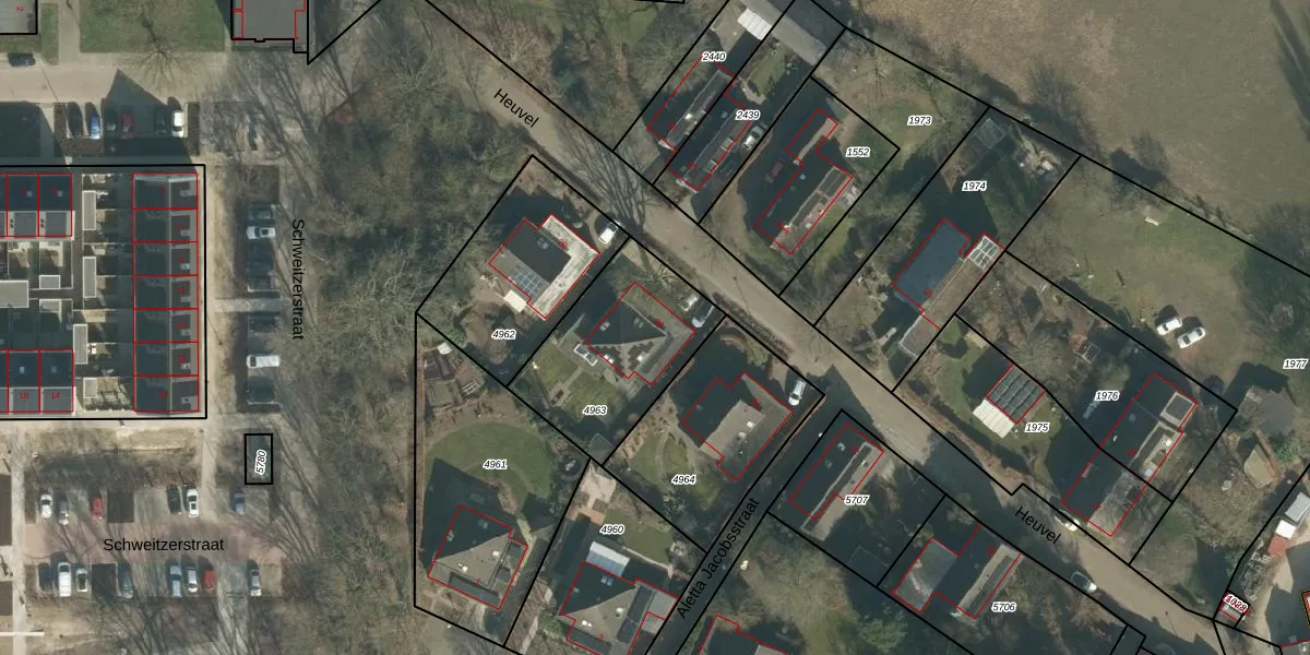 Het perceel waarop Heuvel 26 staat heeft een oppervlakte van 566 m². Dit is een groot perceel. De perceeloppervlakte wordt geregistreerd door het Kadaster. Gedetailleerde informatie over de maten van dit perceel kunt u vinden in het rapport Kadastrale kaart met maatvoering van Heuvel 26.