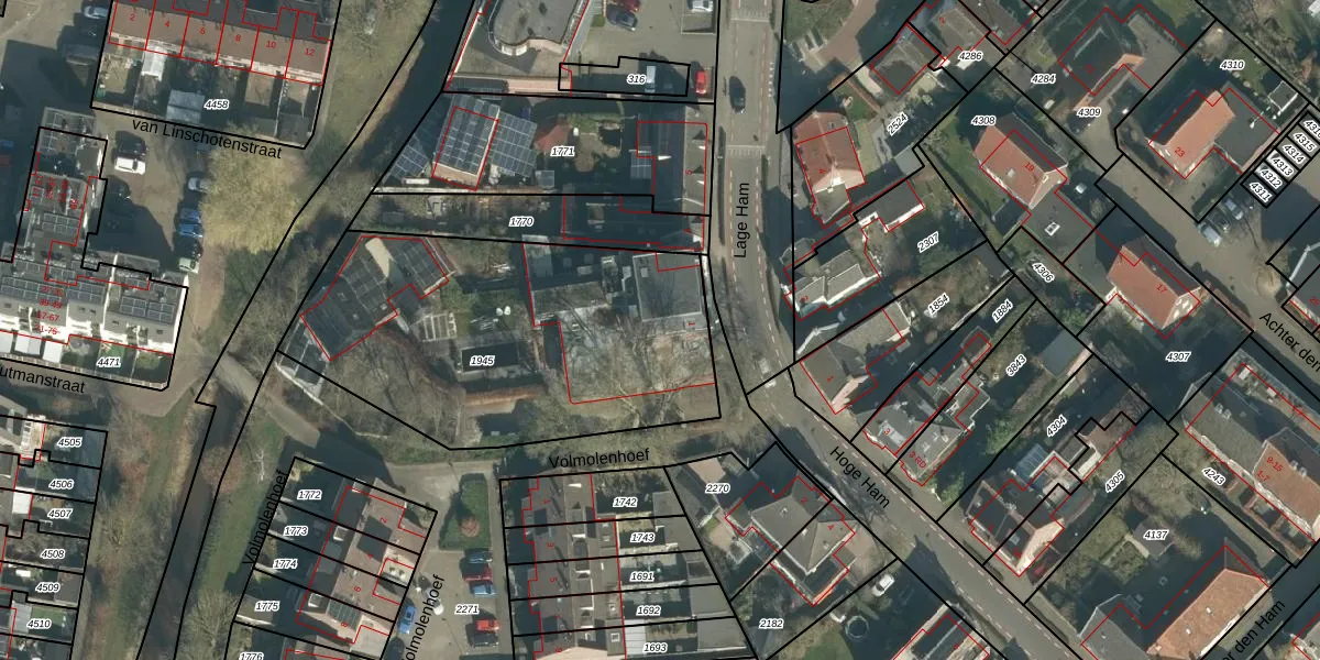 Het perceel waarop Lage Ham 1-B staat heeft een oppervlakte van 1706 m². Dit is een zeer groot perceel. De perceeloppervlakte wordt geregistreerd door het Kadaster. Gedetailleerde informatie over de maten van dit perceel kunt u vinden in het rapport Kadastrale kaart met maatvoering van Lage Ham 1-B.