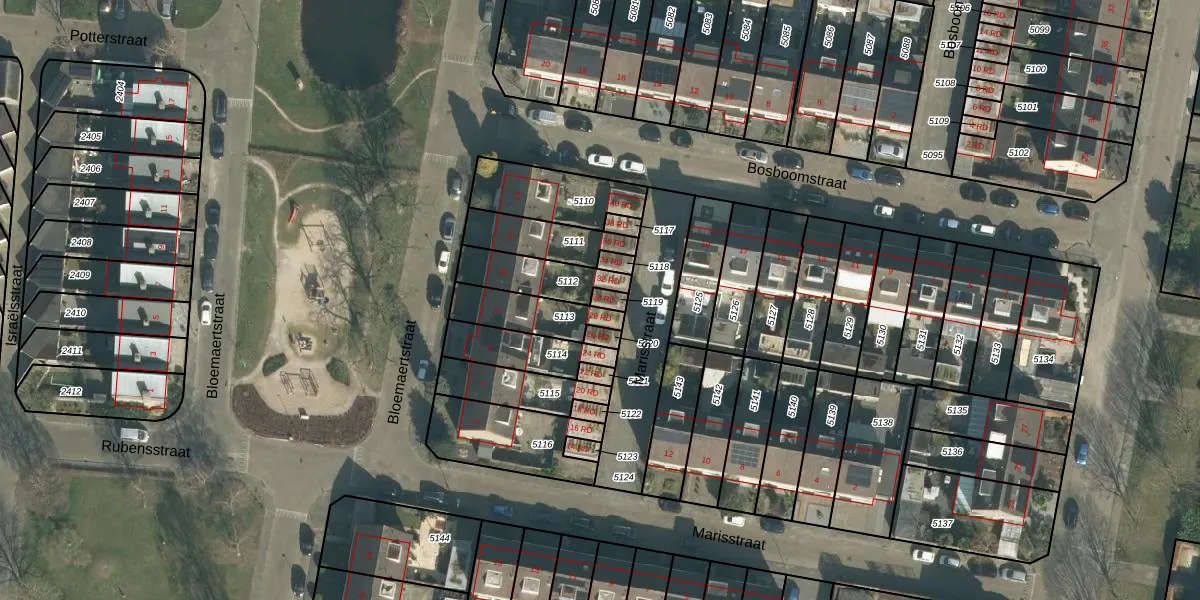 Het perceel waarop Marisstraat 30-RD staat heeft een oppervlakte van 19 m². Dit is een klein perceel. De perceeloppervlakte wordt geregistreerd door het Kadaster. Gedetailleerde informatie over de maten van dit perceel kunt u vinden in het rapport Kadastrale kaart met maatvoering van Marisstraat 30-RD.