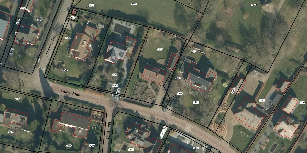 Het perceel waarop Oude Baan 117 staat heeft een oppervlakte van 1147 m². Dit is een zeer groot perceel. De perceeloppervlakte wordt geregistreerd door het Kadaster. Gedetailleerde informatie over de maten van dit perceel kunt u vinden in het rapport Kadastrale kaart met maatvoering van Oude Baan 117.