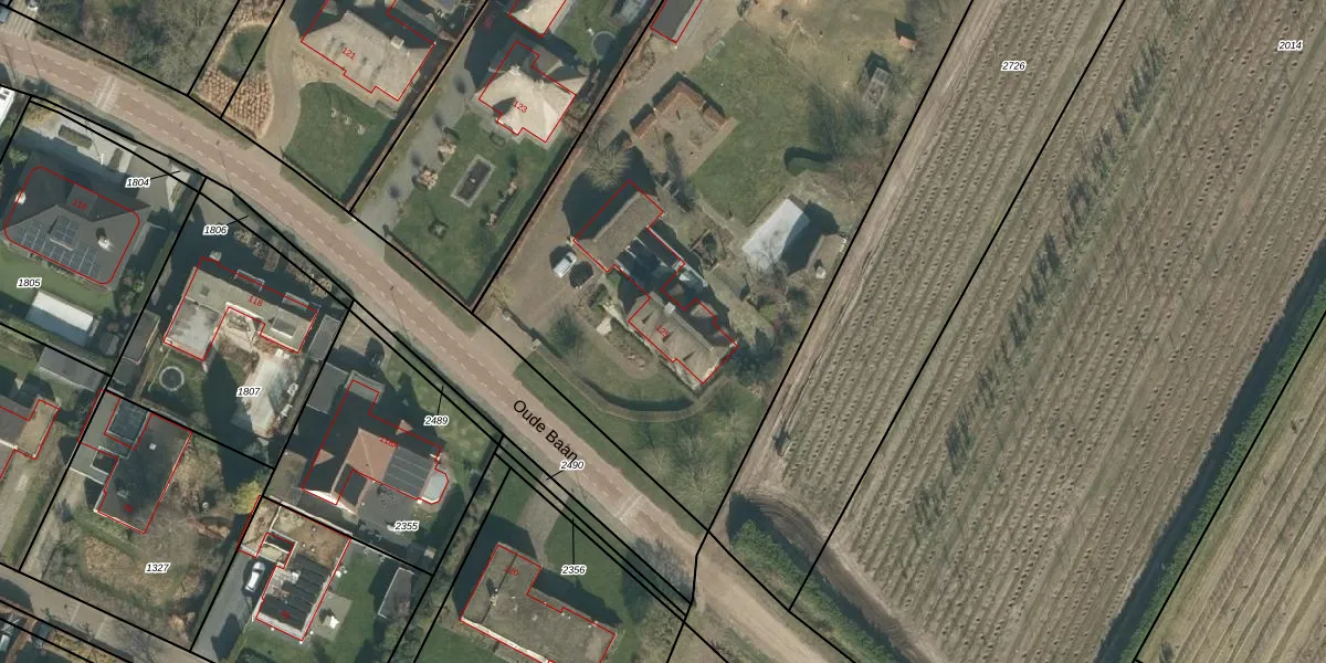 Het perceel waarop Oude Baan 125 staat heeft een oppervlakte van 6140 m². Dit is een zeer groot perceel. De perceeloppervlakte wordt geregistreerd door het Kadaster. Gedetailleerde informatie over de maten van dit perceel kunt u vinden in het rapport Kadastrale kaart met maatvoering van Oude Baan 125.