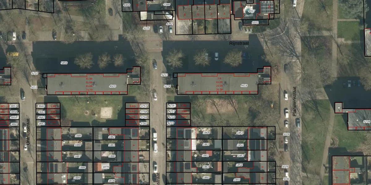 Het perceel waarop Rijnstraat 39 staat heeft een oppervlakte van 569 m². Dit is een groot perceel. De perceeloppervlakte wordt geregistreerd door het Kadaster. Gedetailleerde informatie over de maten van dit perceel kunt u vinden in het rapport Kadastrale kaart met maatvoering van Rijnstraat 39.