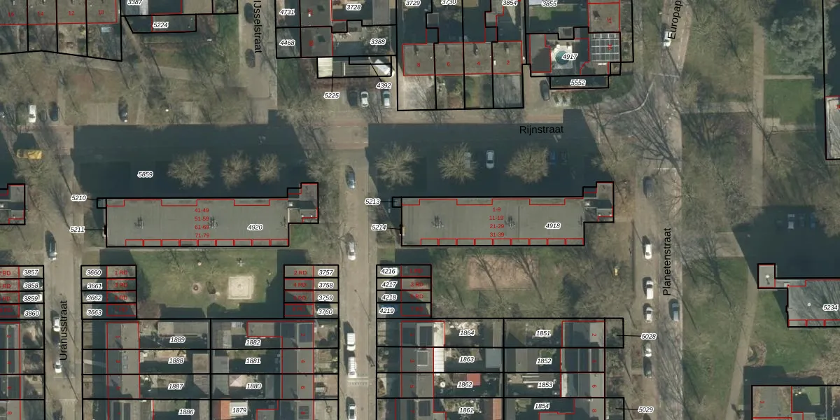 Het perceel waarop Rijnstraat 9 staat heeft een oppervlakte van 569 m². Dit is een groot perceel. De perceeloppervlakte wordt geregistreerd door het Kadaster. Gedetailleerde informatie over de maten van dit perceel kunt u vinden in het rapport Kadastrale kaart met maatvoering van Rijnstraat 9.
