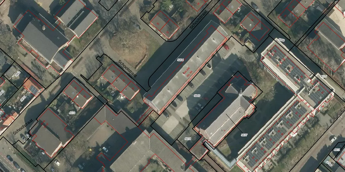 Het perceel waarop Schoolstraat 30-H staat heeft een oppervlakte van 2530 m². Dit is een zeer groot perceel. De perceeloppervlakte wordt geregistreerd door het Kadaster. Gedetailleerde informatie over de maten van dit perceel kunt u vinden in het rapport Kadastrale kaart met maatvoering van Schoolstraat 30-H.