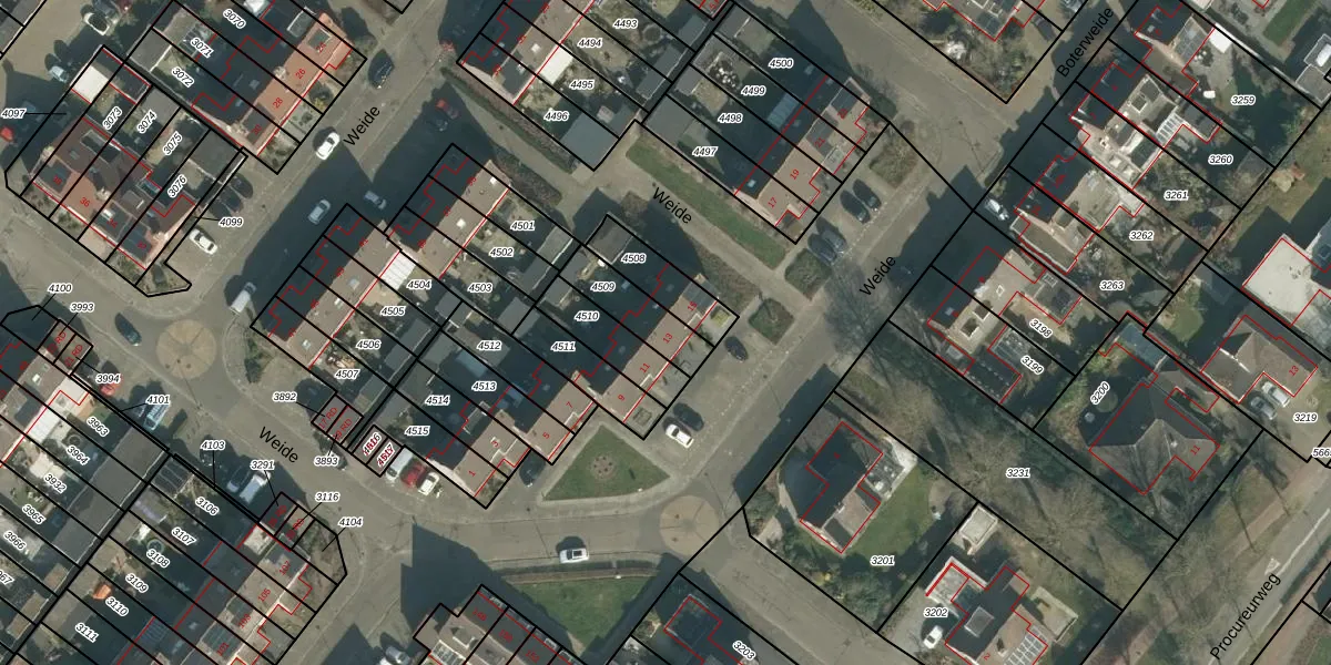 Weide 13 is gelegen op kadastraal perceel DGN01B4509. Deze kadastrale aanduiding is uniek en wordt gebruikt door het Kadaster om eigendomsrechten en andere zakelijke rechten vast te leggen. Het perceel maakt onderdeel uit van de kadastrale gemeente Dongen.