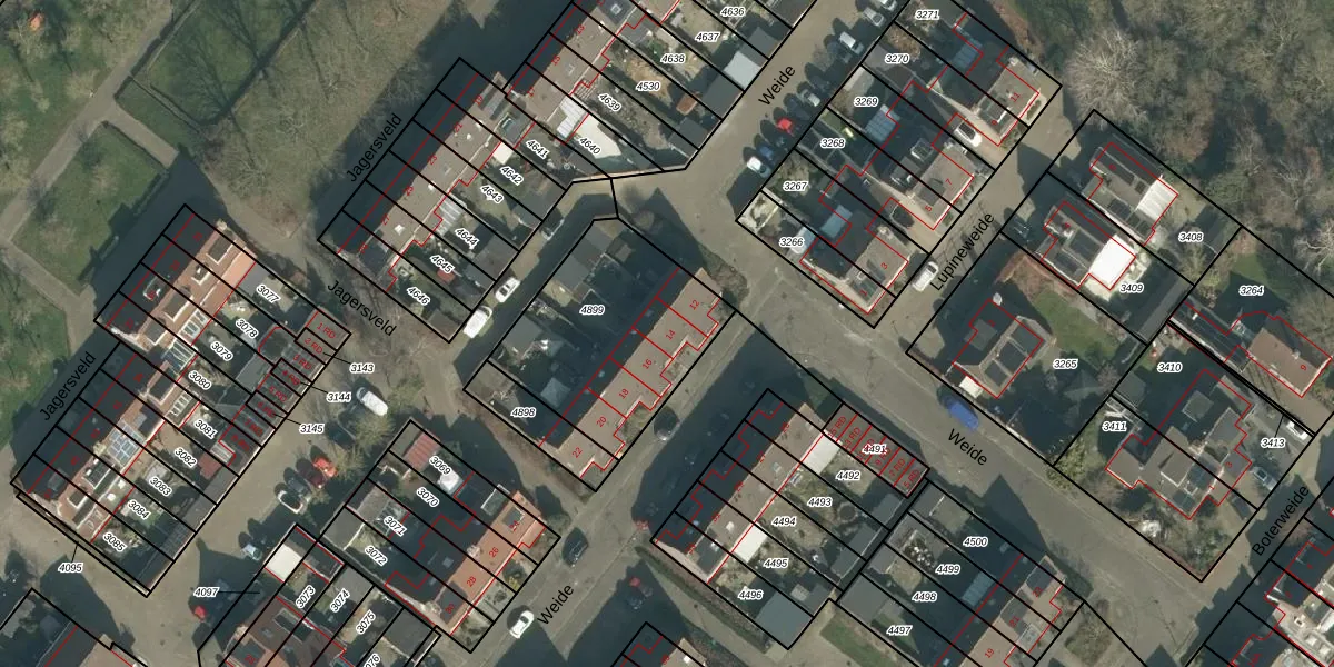 Het perceel waarop Weide 14 staat heeft een oppervlakte van 714 m². Dit is een groot perceel. De perceeloppervlakte wordt geregistreerd door het Kadaster. Gedetailleerde informatie over de maten van dit perceel kunt u vinden in het rapport Kadastrale kaart met maatvoering van Weide 14.