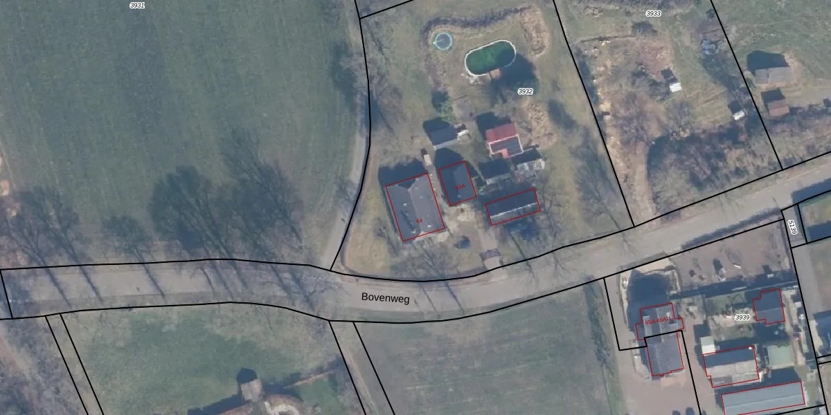 Het perceel waarop Bovenweg 64 staat heeft een oppervlakte van 3710 m². Dit is een zeer groot perceel. De perceeloppervlakte wordt geregistreerd door het Kadaster. Gedetailleerde informatie over de maten van dit perceel kunt u vinden in het rapport Kadastrale kaart met maatvoering van Bovenweg 64.