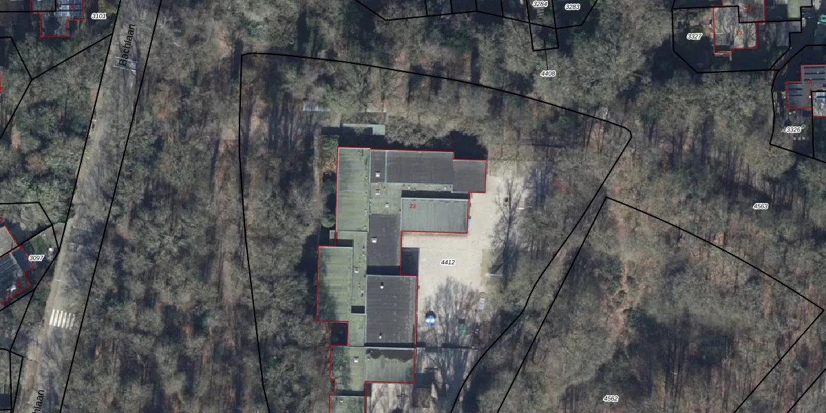 Het perceel waarop Bachlaan 23 staat heeft een oppervlakte van 6870 m². Dit is een zeer groot perceel. De perceeloppervlakte wordt geregistreerd door het Kadaster. Gedetailleerde informatie over de maten van dit perceel kunt u vinden in het rapport Kadastrale kaart met maatvoering van Bachlaan 23.