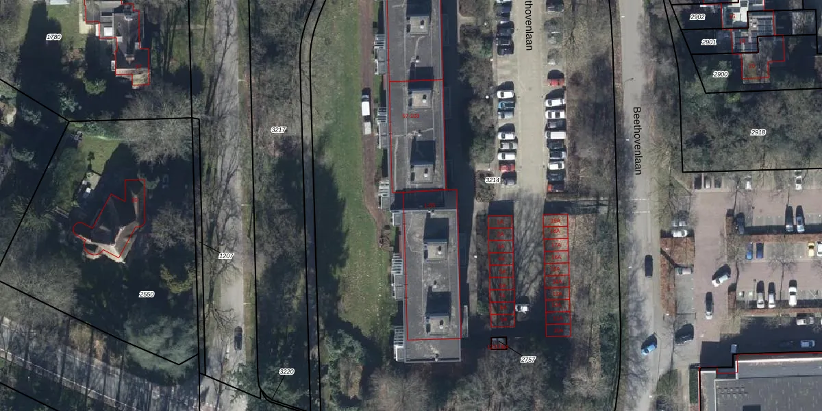 Het perceel waarop Beethovenlaan 1 staat heeft een oppervlakte van 1,0 ha. Dit is een zeer groot perceel. De perceeloppervlakte wordt geregistreerd door het Kadaster. Gedetailleerde informatie over de maten van dit perceel kunt u vinden in het rapport Kadastrale kaart met maatvoering van Beethovenlaan 1.