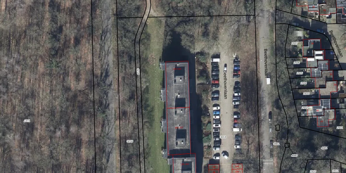 Het perceel waarop Beethovenlaan 229 staat heeft een oppervlakte van 9120 m². Dit is een zeer groot perceel. De perceeloppervlakte wordt geregistreerd door het Kadaster. Gedetailleerde informatie over de maten van dit perceel kunt u vinden in het rapport Kadastrale kaart met maatvoering van Beethovenlaan 229.