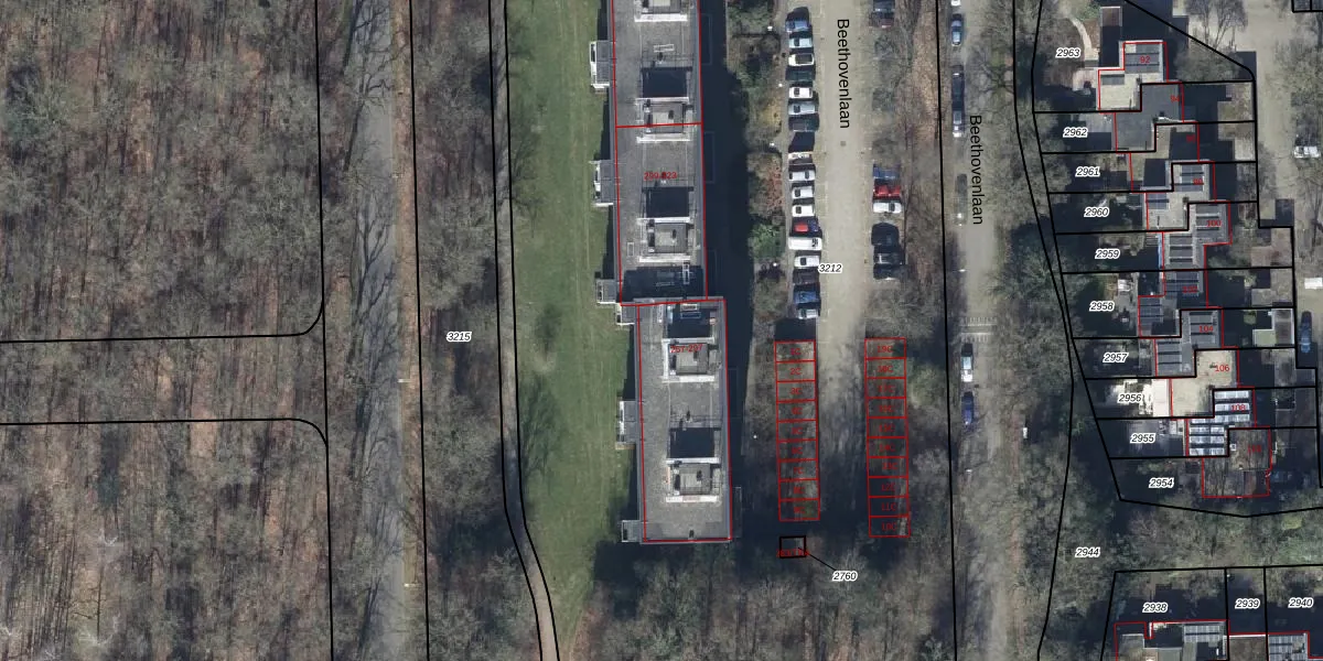 Het perceel waarop Beethovenlaan 279 staat heeft een oppervlakte van 8820 m². Dit is een zeer groot perceel. De perceeloppervlakte wordt geregistreerd door het Kadaster. Gedetailleerde informatie over de maten van dit perceel kunt u vinden in het rapport Kadastrale kaart met maatvoering van Beethovenlaan 279.
