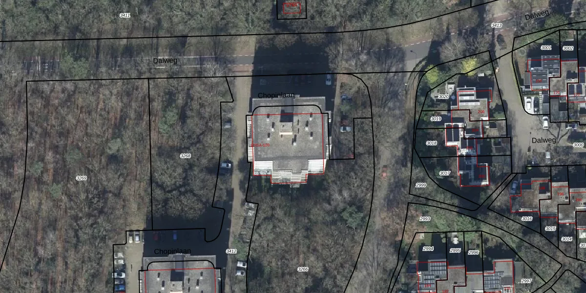 Het perceel waarop Chopinlaan 104 staat heeft een oppervlakte van 3330 m². Dit is een zeer groot perceel. De perceeloppervlakte wordt geregistreerd door het Kadaster. Gedetailleerde informatie over de maten van dit perceel kunt u vinden in het rapport Kadastrale kaart met maatvoering van Chopinlaan 104.
