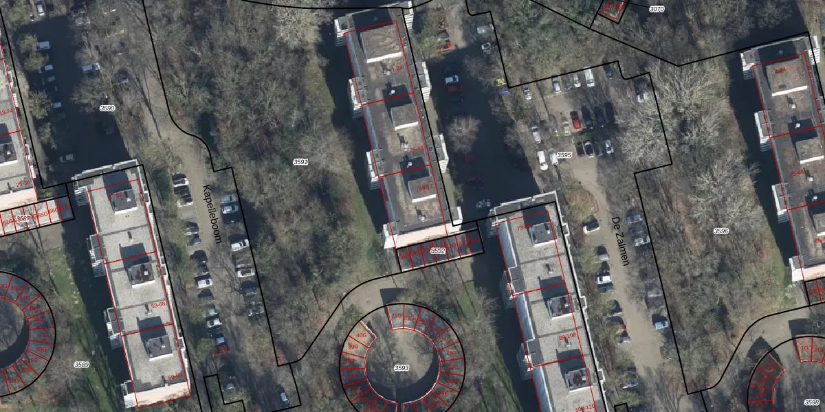 Het perceel waarop De Zalmen 49 staat heeft een oppervlakte van 3990 m². Dit is een zeer groot perceel. De perceeloppervlakte wordt geregistreerd door het Kadaster. Gedetailleerde informatie over de maten van dit perceel kunt u vinden in het rapport Kadastrale kaart met maatvoering van De Zalmen 49.