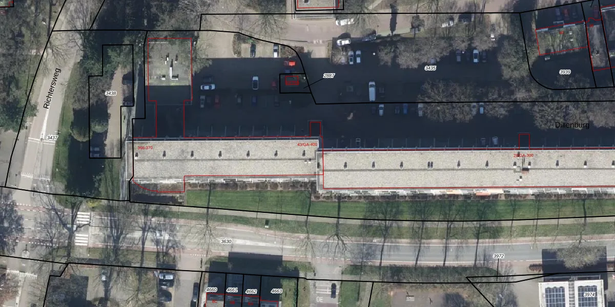Het perceel waarop Dillenburg 360 staat heeft een oppervlakte van 1,3 ha. Dit is een zeer groot perceel. De perceeloppervlakte wordt geregistreerd door het Kadaster. Gedetailleerde informatie over de maten van dit perceel kunt u vinden in het rapport Kadastrale kaart met maatvoering van Dillenburg 360.
