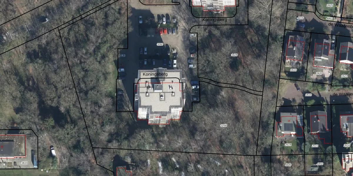 Het perceel waarop Koningsberg 1-A staat heeft een oppervlakte van 4890 m². Dit is een zeer groot perceel. De perceeloppervlakte wordt geregistreerd door het Kadaster. Gedetailleerde informatie over de maten van dit perceel kunt u vinden in het rapport Kadastrale kaart met maatvoering van Koningsberg 1-A.