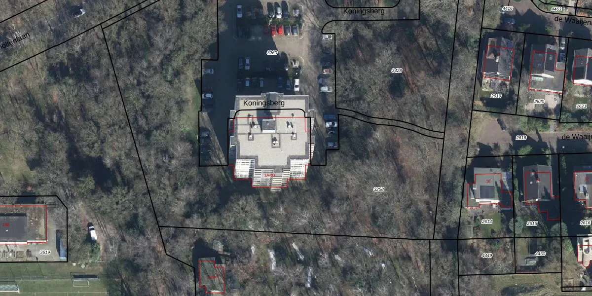 Het perceel waarop Koningsberg 50 staat heeft een oppervlakte van 4890 m². Dit is een zeer groot perceel. De perceeloppervlakte wordt geregistreerd door het Kadaster. Gedetailleerde informatie over de maten van dit perceel kunt u vinden in het rapport Kadastrale kaart met maatvoering van Koningsberg 50.