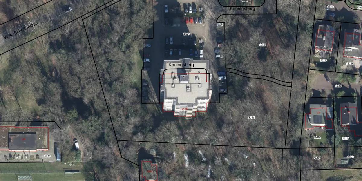 Het perceel waarop Koningsberg 70 staat heeft een oppervlakte van 4890 m². Dit is een zeer groot perceel. De perceeloppervlakte wordt geregistreerd door het Kadaster. Gedetailleerde informatie over de maten van dit perceel kunt u vinden in het rapport Kadastrale kaart met maatvoering van Koningsberg 70.