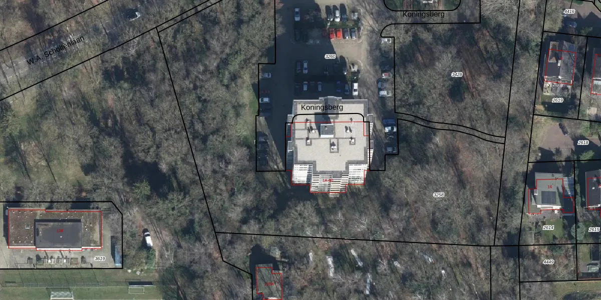 Het perceel waarop Koningsberg 79 staat heeft een oppervlakte van 4890 m². Dit is een zeer groot perceel. De perceeloppervlakte wordt geregistreerd door het Kadaster. Gedetailleerde informatie over de maten van dit perceel kunt u vinden in het rapport Kadastrale kaart met maatvoering van Koningsberg 79.