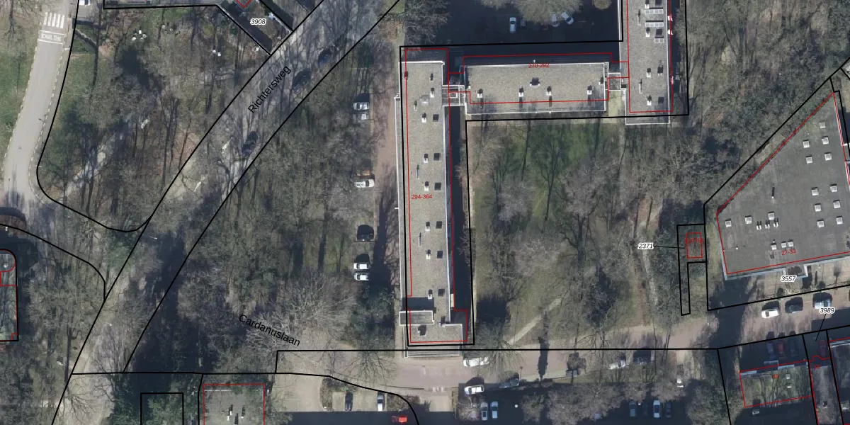 Het perceel waarop Richtersweg 336 staat heeft een oppervlakte van 5970 m². Dit is een zeer groot perceel. De perceeloppervlakte wordt geregistreerd door het Kadaster. Gedetailleerde informatie over de maten van dit perceel kunt u vinden in het rapport Kadastrale kaart met maatvoering van Richtersweg 336.