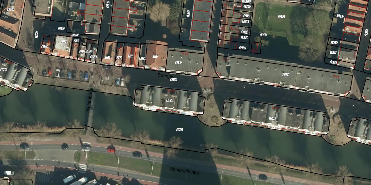Het perceel waarop Boogjes 82 staat heeft een oppervlakte van 477 m². Dit is een groot perceel. De perceeloppervlakte wordt geregistreerd door het Kadaster. Gedetailleerde informatie over de maten van dit perceel kunt u vinden in het rapport Kadastrale kaart met maatvoering van Boogjes 82.