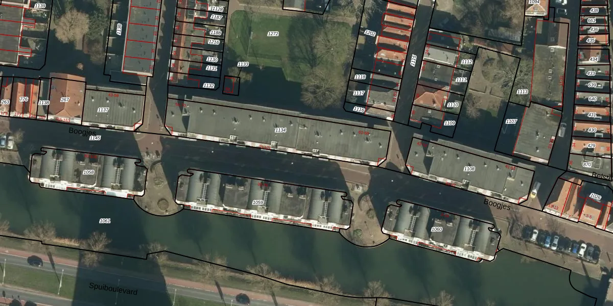 Het perceel waarop Boogjes 89 staat heeft een oppervlakte van 875 m². Dit is een groot perceel. De perceeloppervlakte wordt geregistreerd door het Kadaster. Gedetailleerde informatie over de maten van dit perceel kunt u vinden in het rapport Kadastrale kaart met maatvoering van Boogjes 89.