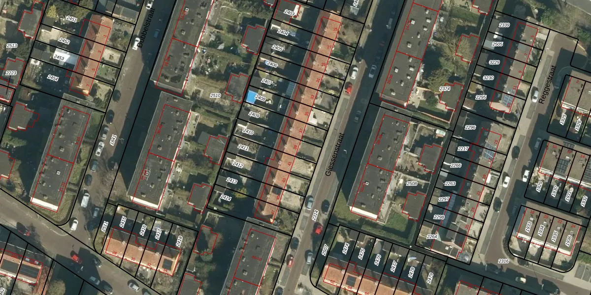 Giessenstraat 39 is gelegen op kadastraal perceel DDT00I2410. Deze kadastrale aanduiding is uniek en wordt gebruikt door het Kadaster om eigendomsrechten en andere zakelijke rechten vast te leggen. Het perceel maakt onderdeel uit van de kadastrale gemeente Dordrecht.
