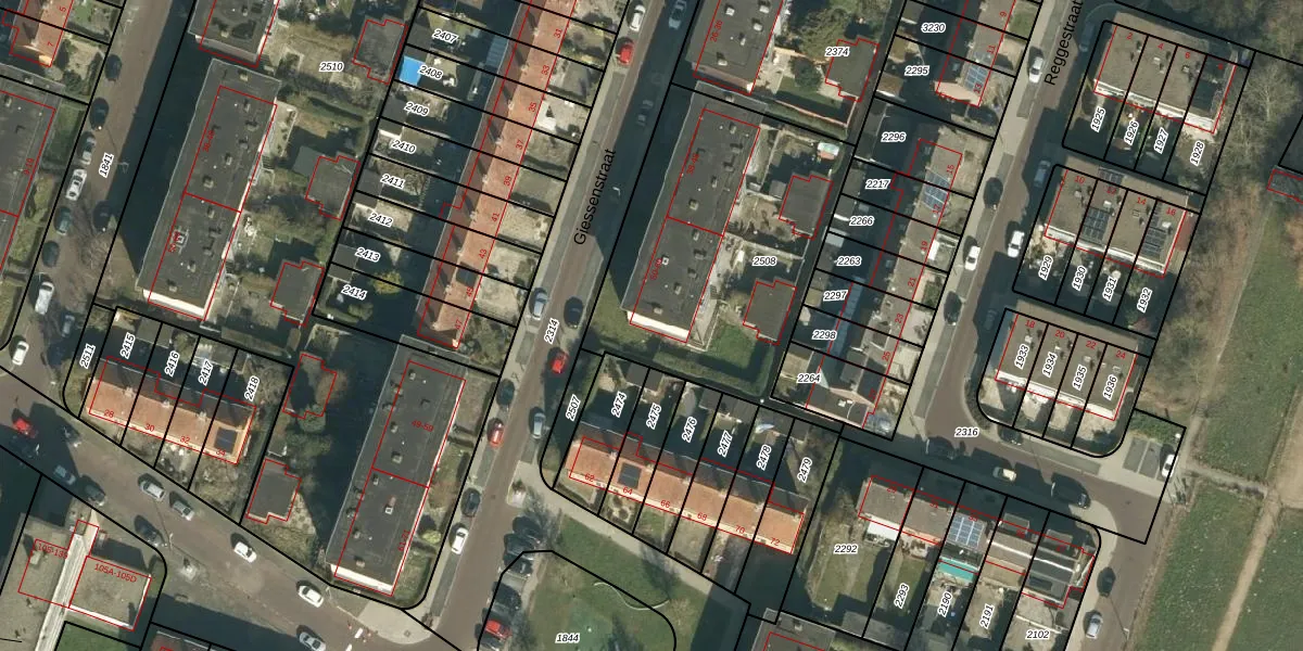 Het perceel waarop Giessenstraat 60 staat heeft een oppervlakte van 1300 m². Dit is een zeer groot perceel. De perceeloppervlakte wordt geregistreerd door het Kadaster. Gedetailleerde informatie over de maten van dit perceel kunt u vinden in het rapport Kadastrale kaart met maatvoering van Giessenstraat 60.