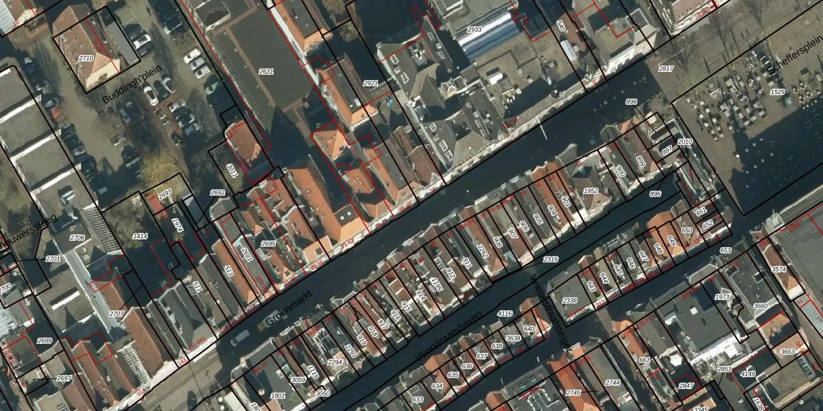 Het perceel waarop Groenmarkt 39 staat heeft een oppervlakte van 1858 m². Dit is een zeer groot perceel. De perceeloppervlakte wordt geregistreerd door het Kadaster. Gedetailleerde informatie over de maten van dit perceel kunt u vinden in het rapport Kadastrale kaart met maatvoering van Groenmarkt 39.